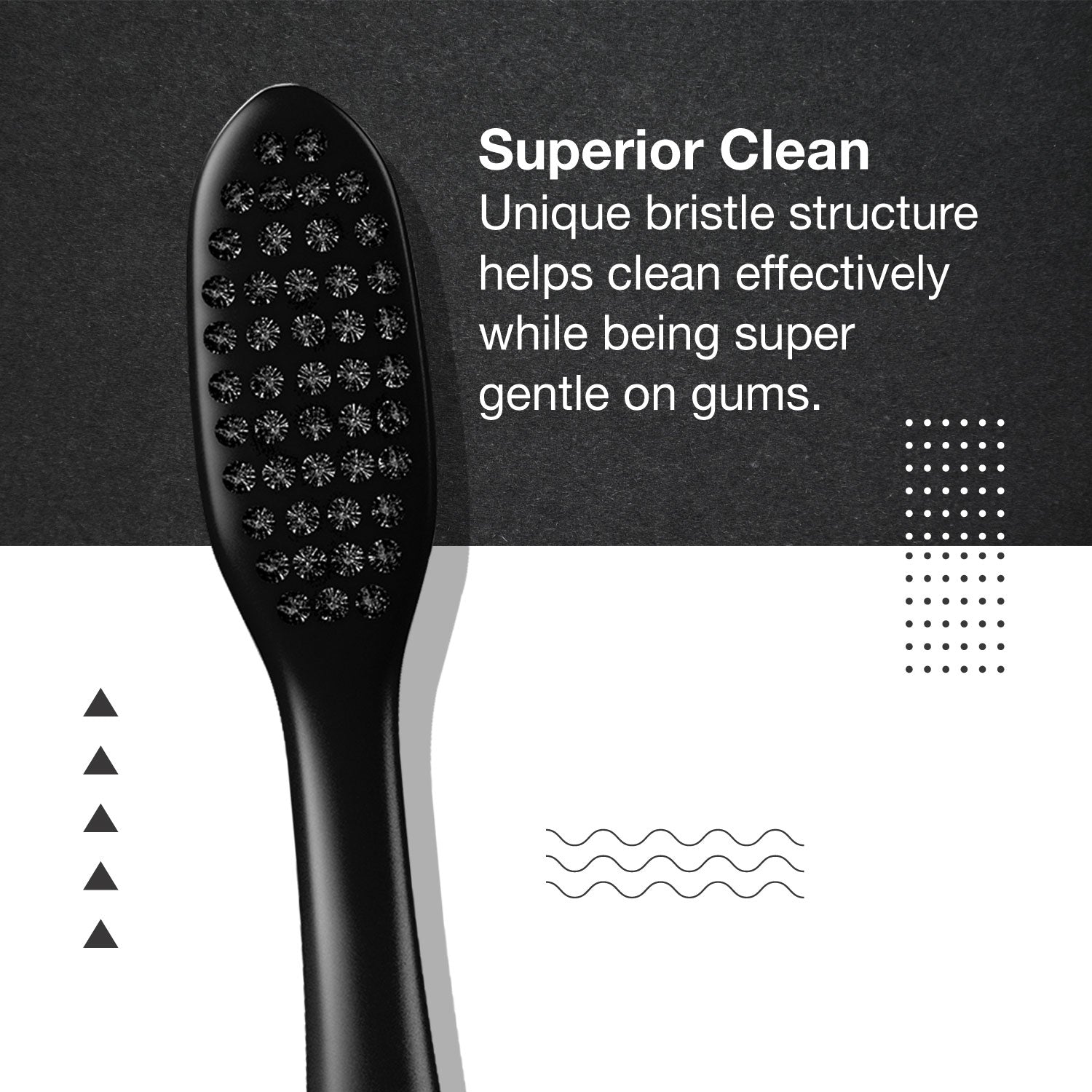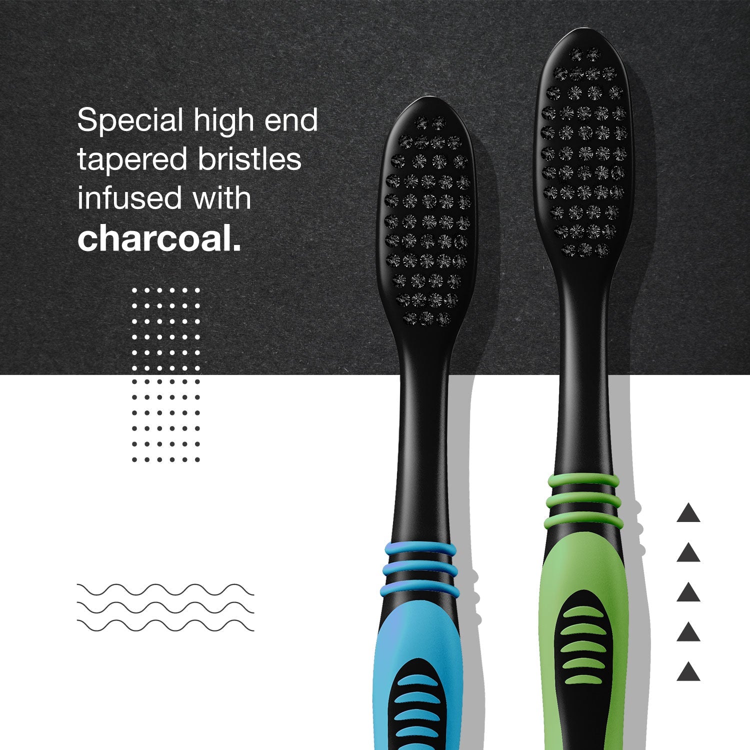 Our Naturals range of products provide holistic dental care by tackling dental issues such as discolouration of teeth, bad breath, inflammation of gums and cavities. High end tapered bristles infused with charcoal offer better cleaning by reaching hard to reach places in your mouth while also being soft and gentle on your teeth and gums. Natural charcoal is mildly abrasive and can help remove surface stains from teeth.