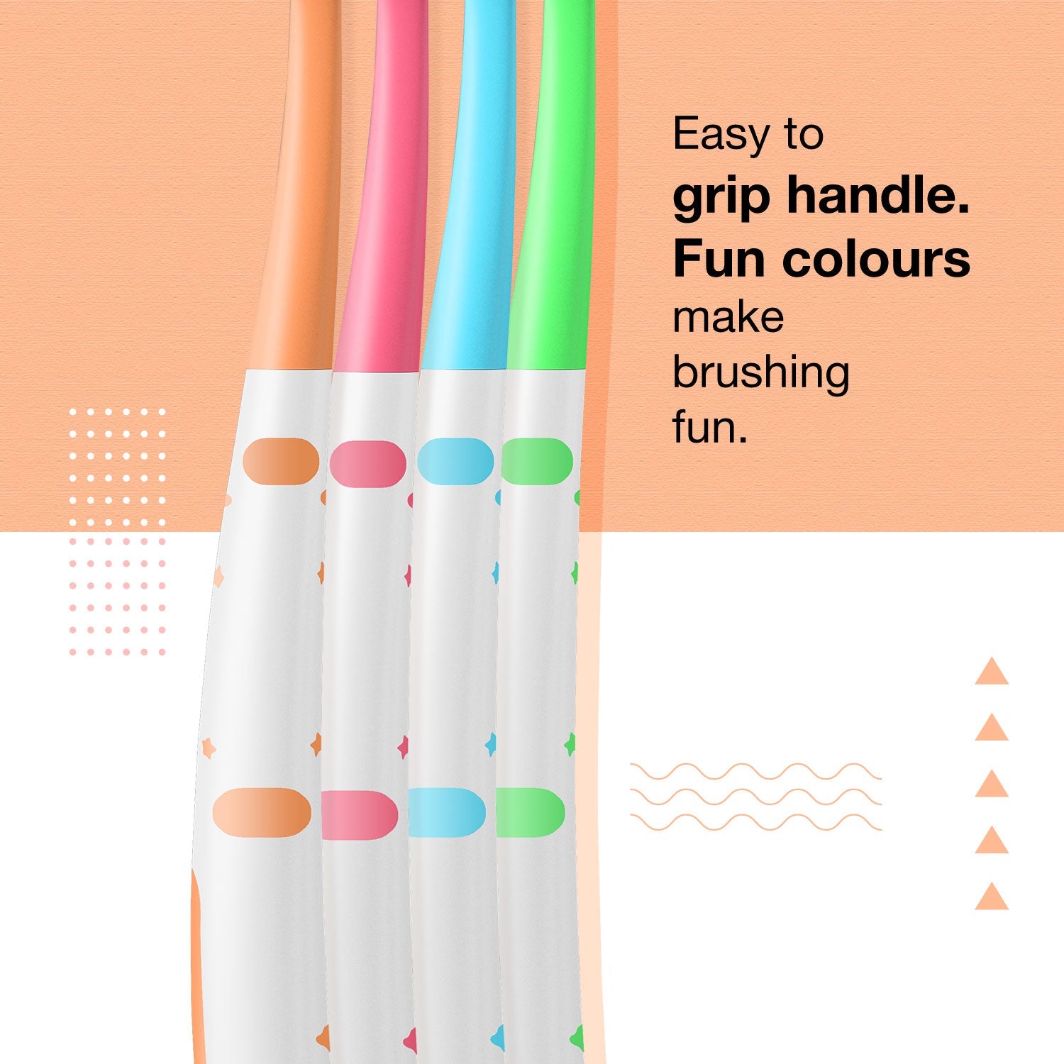 Made from special double tapered bristles that are gentle on teeth and gums. A smooth and easy grip helps maintain good control while brushing. Vibrant colours to add an element of fun to the everyday brushing experience.